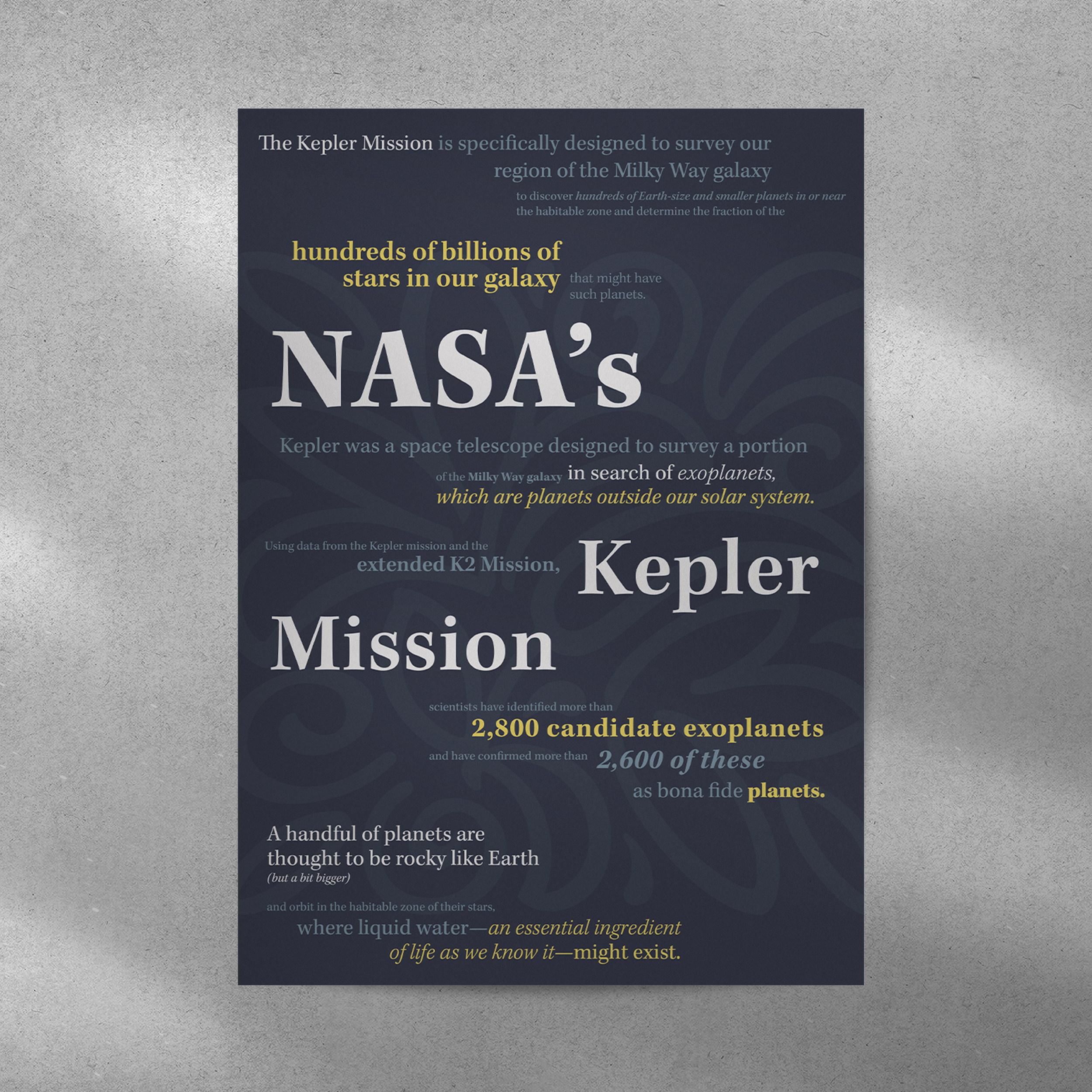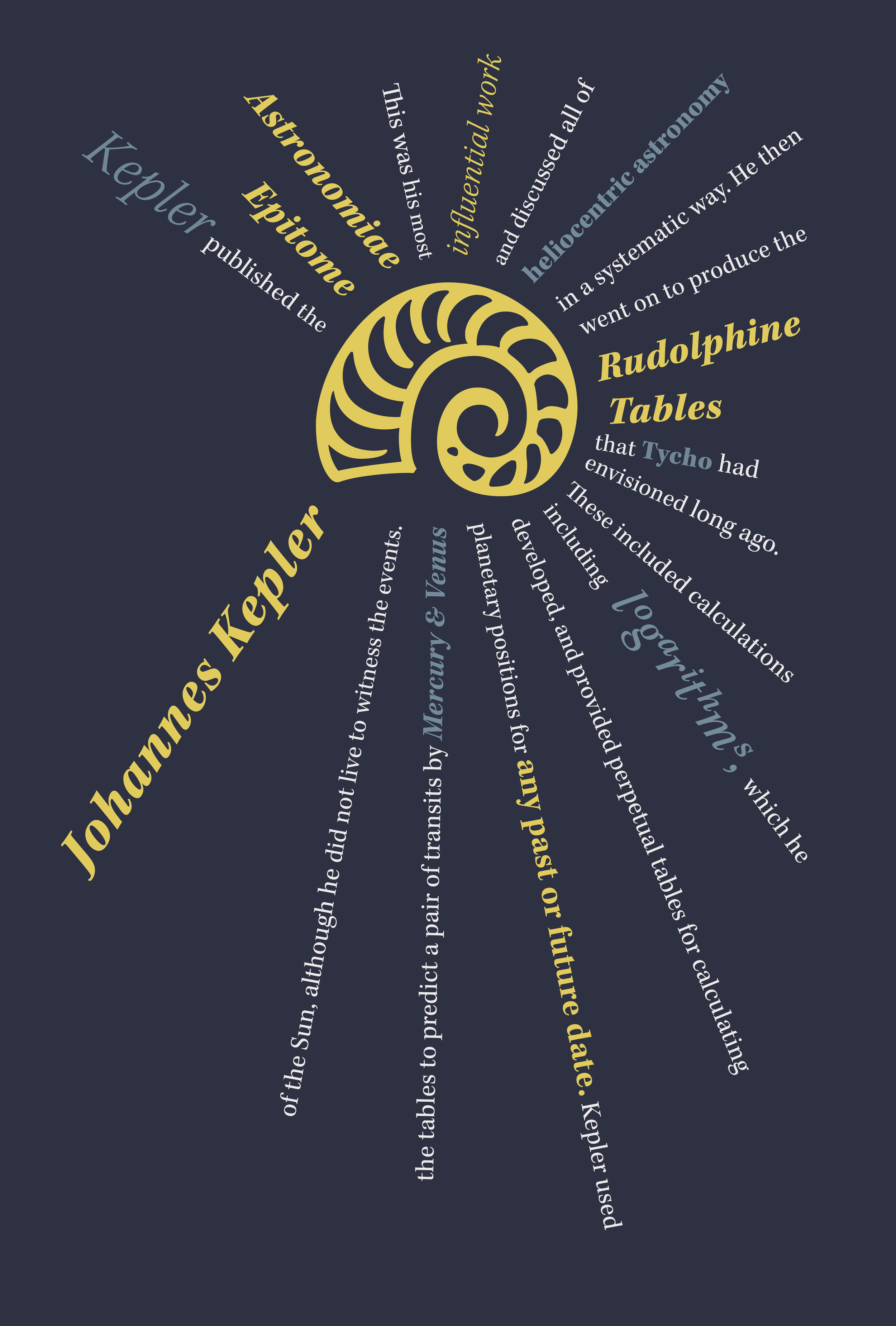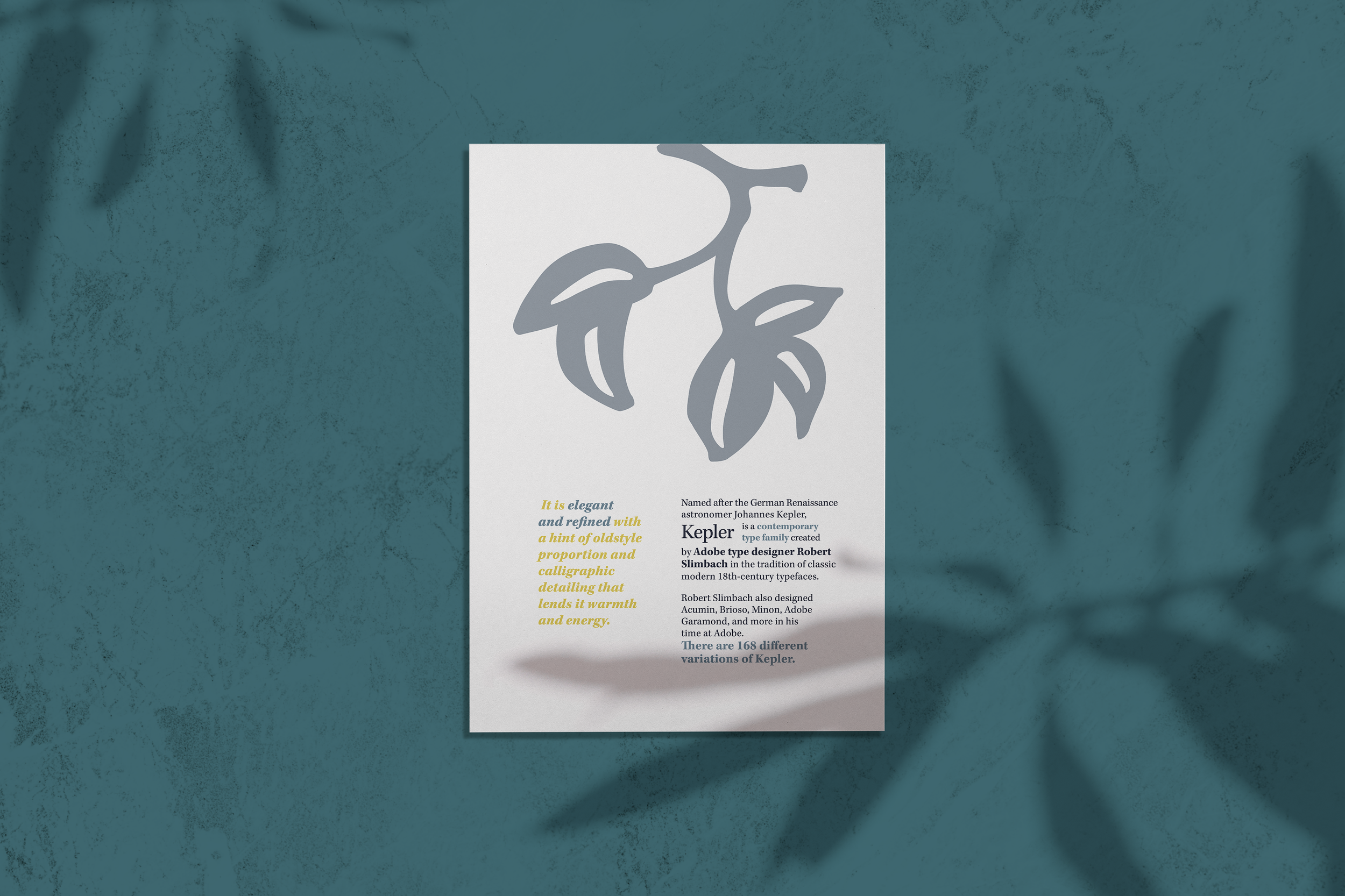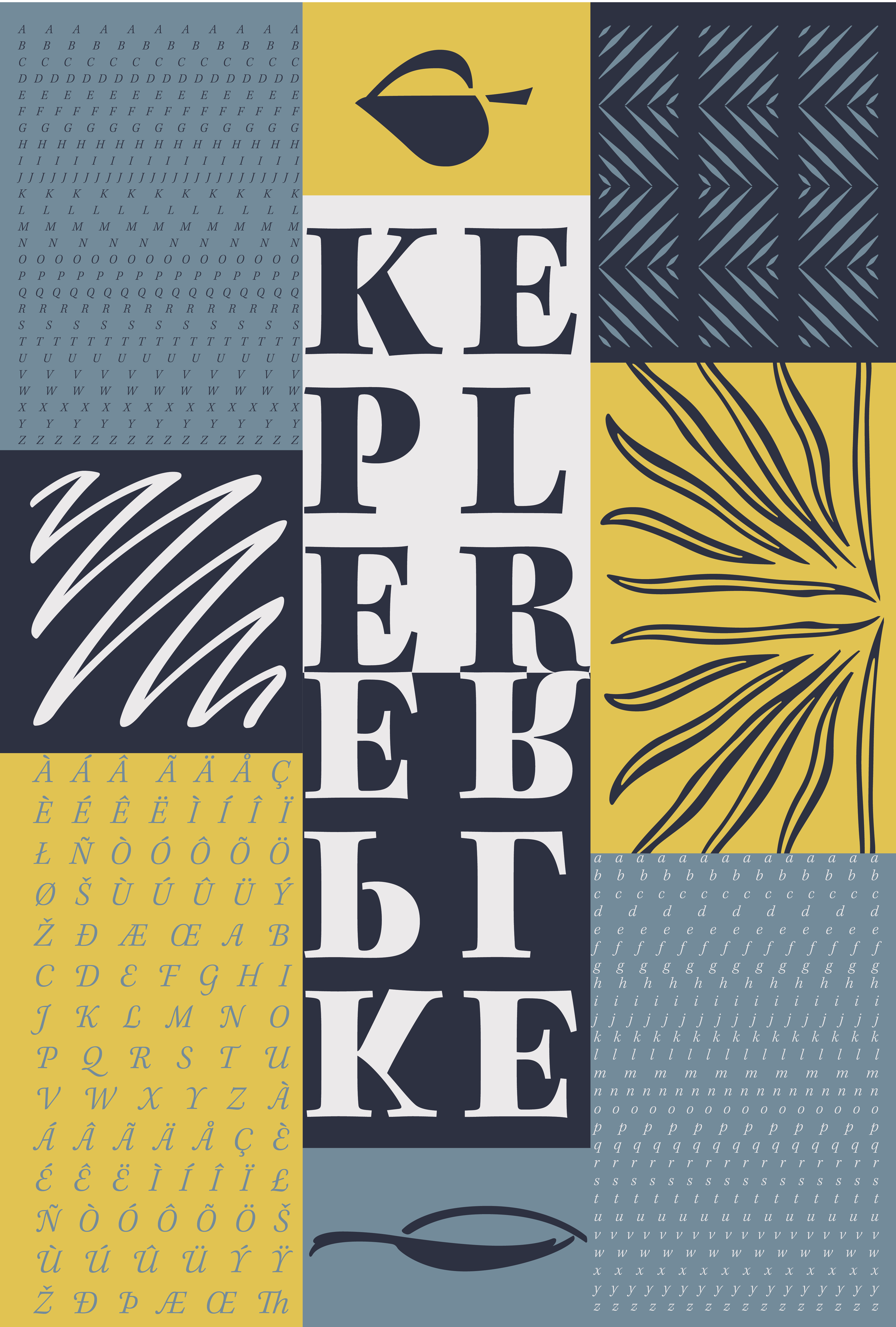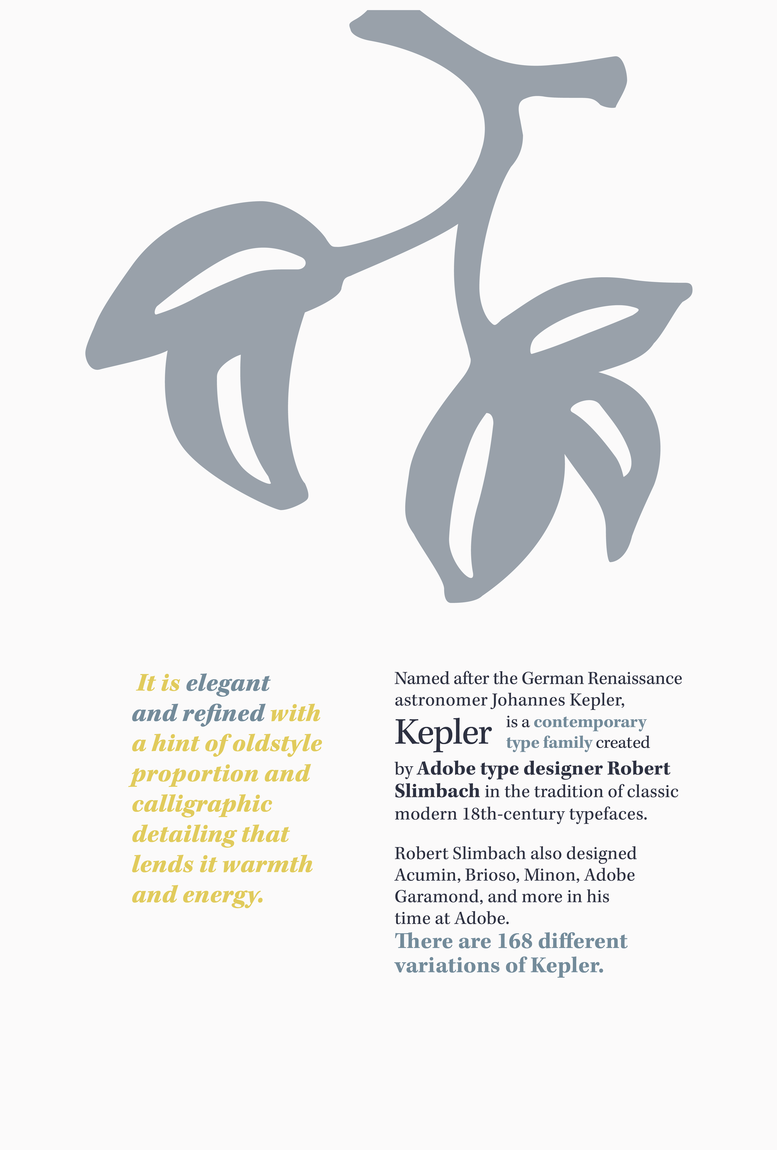 Using the typeface “Kepler”, I displayed the eight different type systems: Axial, Bilateral, Column, Dilatational, Manuscript, Modular, Radial, and Transitional.